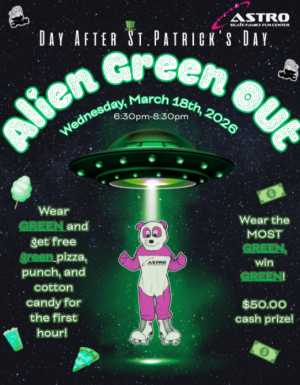 Wear green and get free pizza, punch and cotton candy for the first hour!